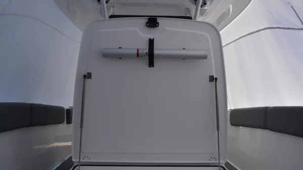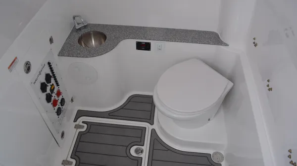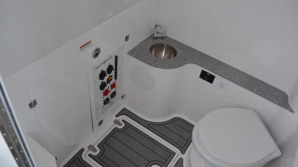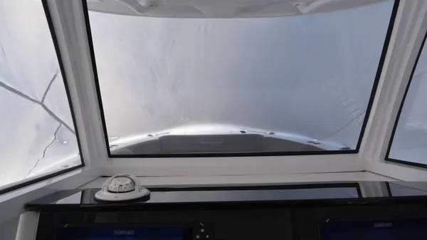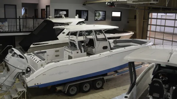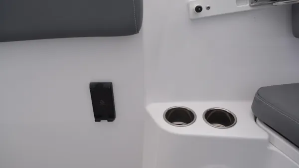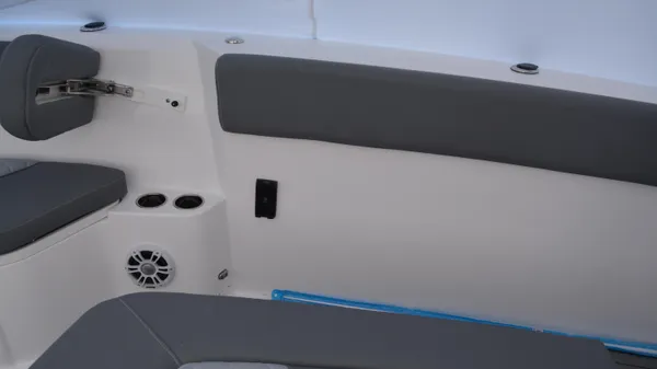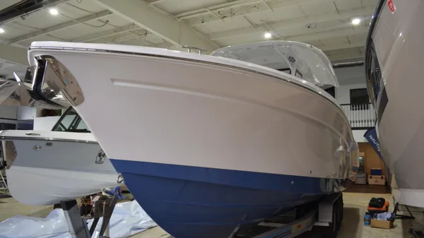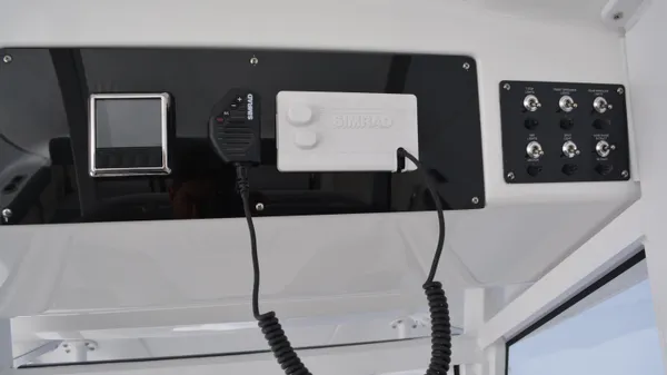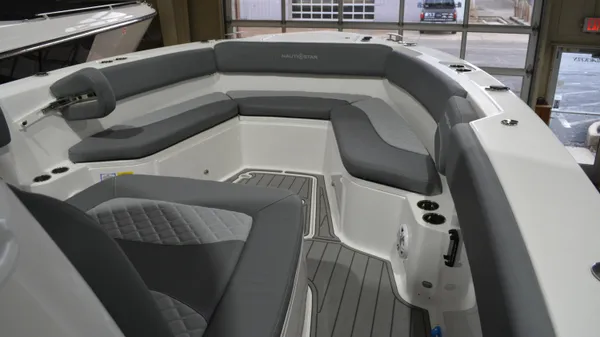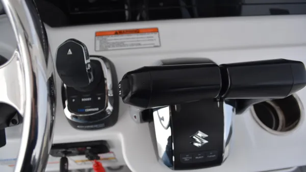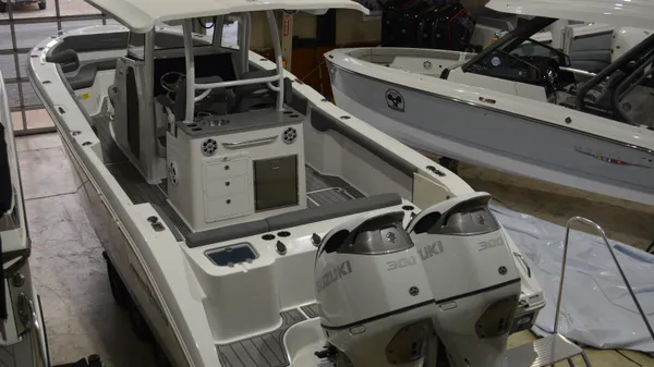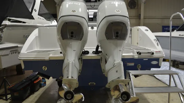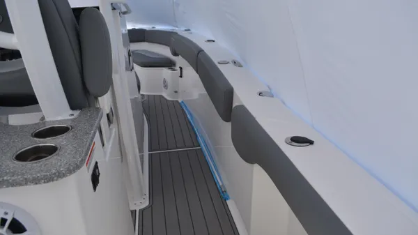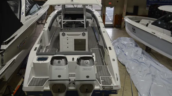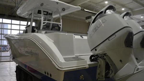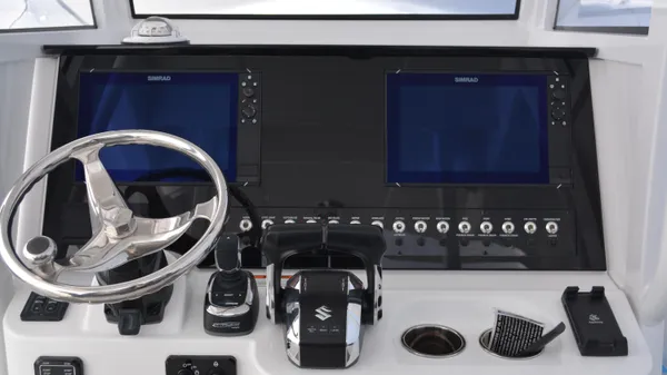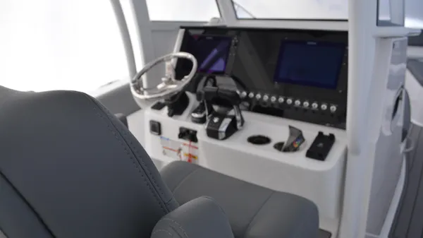 This Offshore is trimmed in a two tone colorway with a White upper and Storm lower which Shale interior. Equipped with bow shade, underwater lights, dual Simrad 12", marine mat and joystck! Reserve your new boat today!