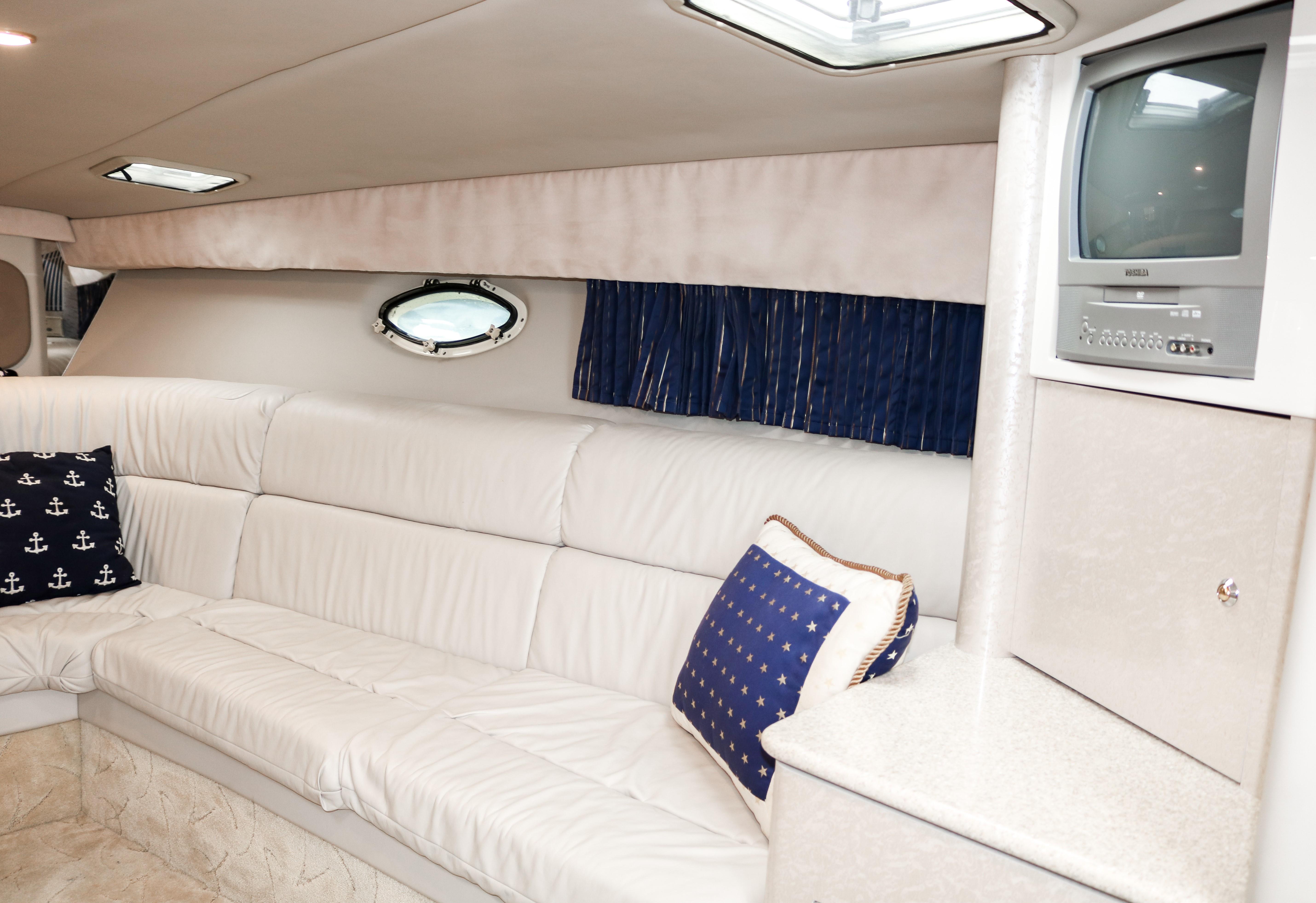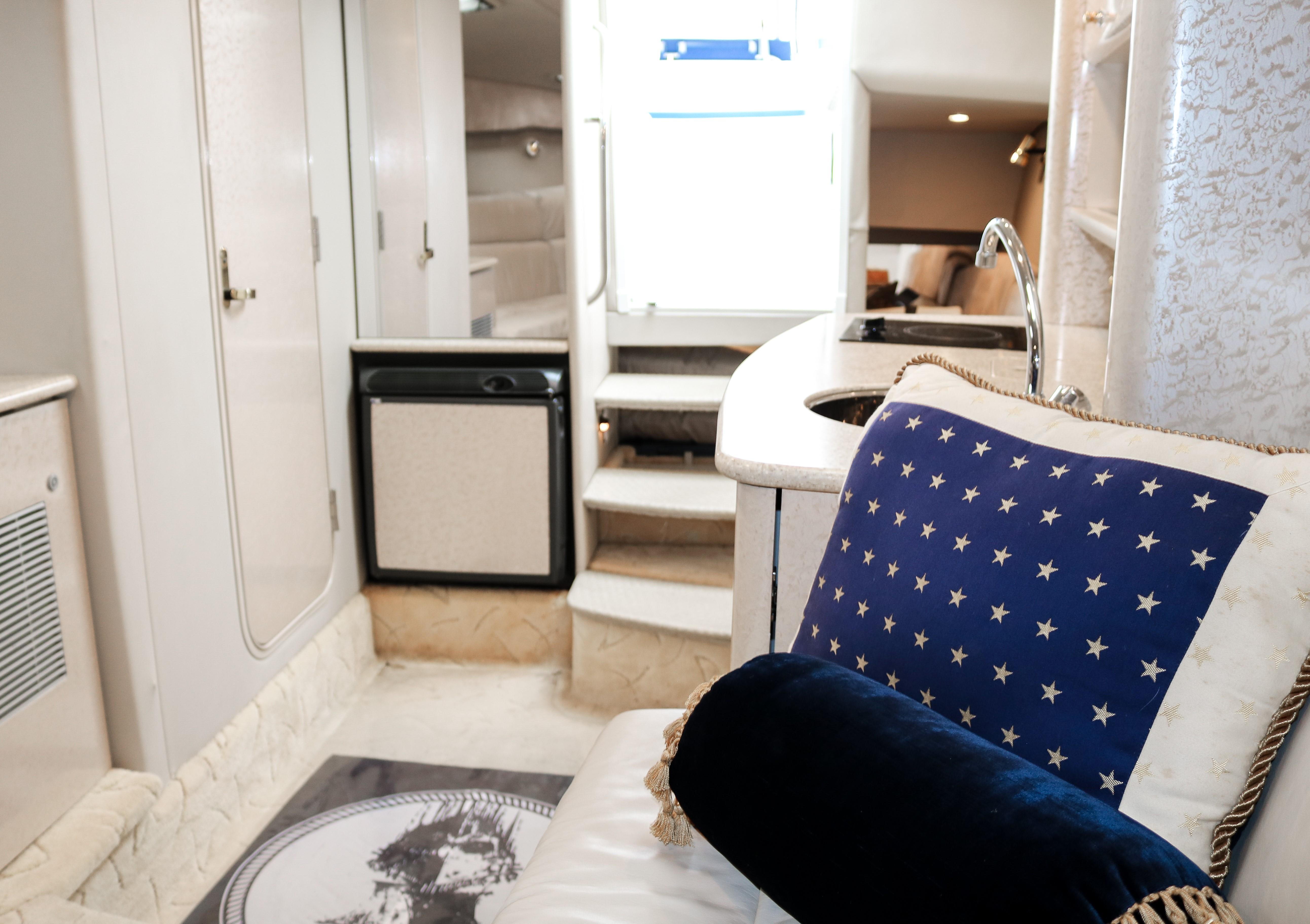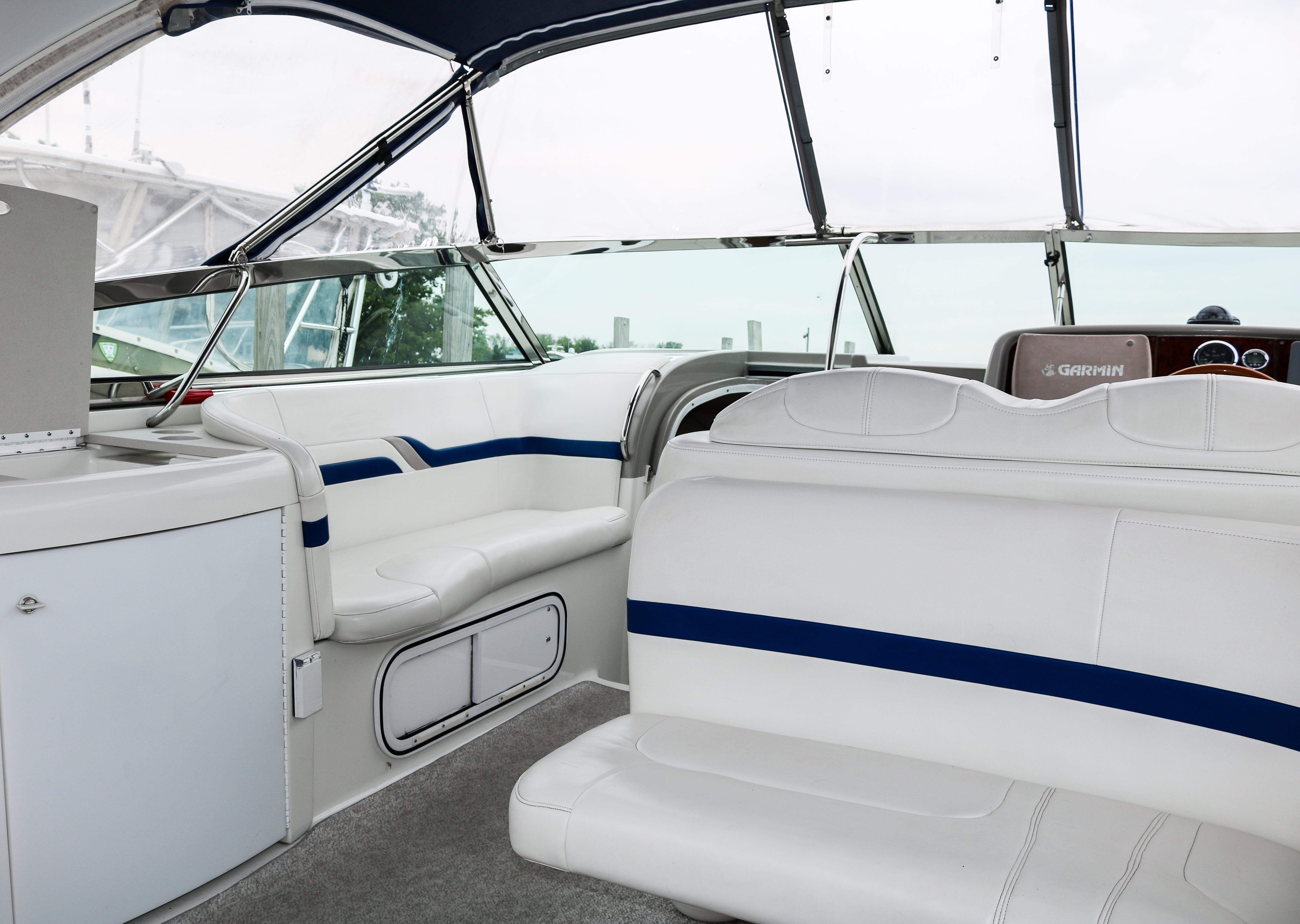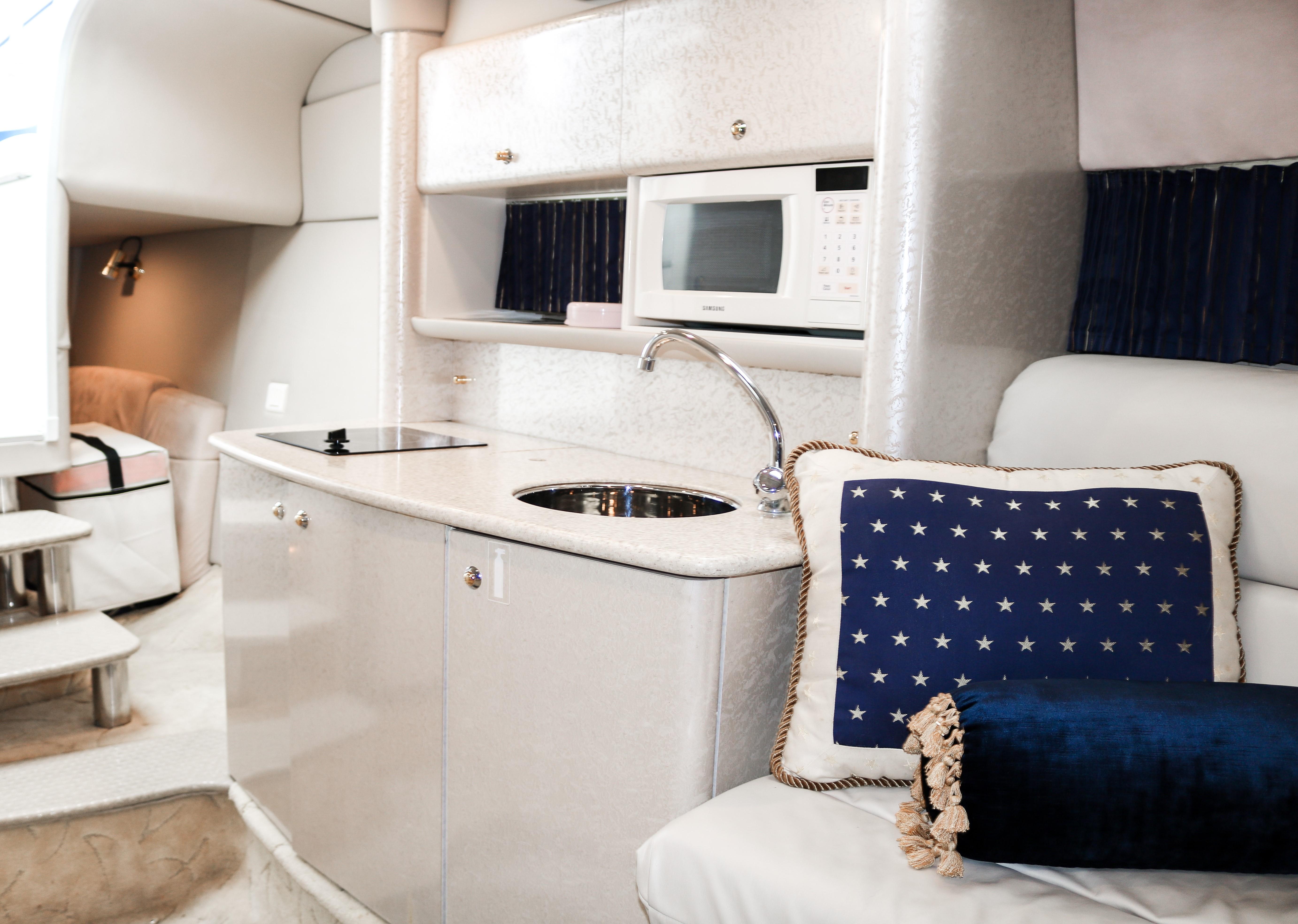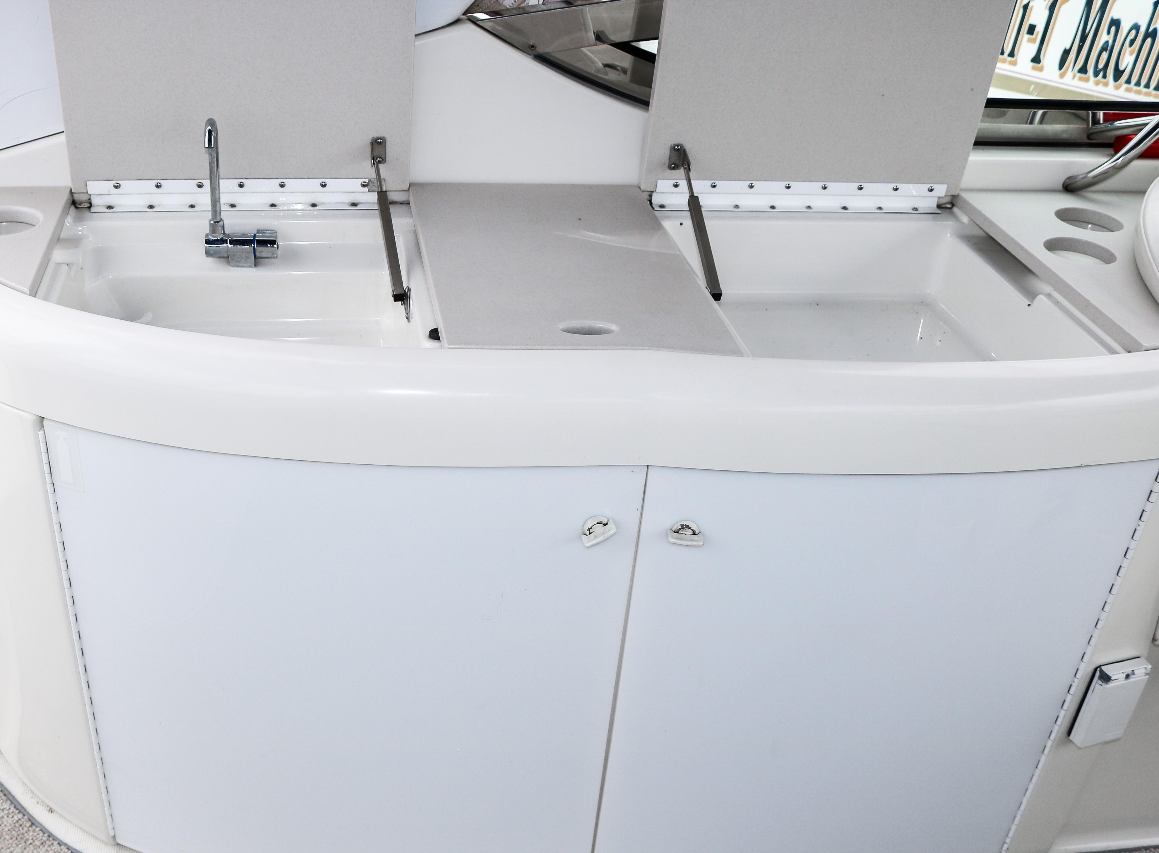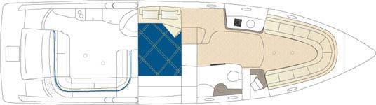 Below deck accommodations are surprisingly spacious, considering the performance-boat styling. A Corian-trimmed galley has a cooktop, microwave and sink. A dual-voltage refrigerator/freezer is several steps away. A fully enclosed head with an integral shower area has an easy-to-clean molded fiberglass finish trimmed in Corian.