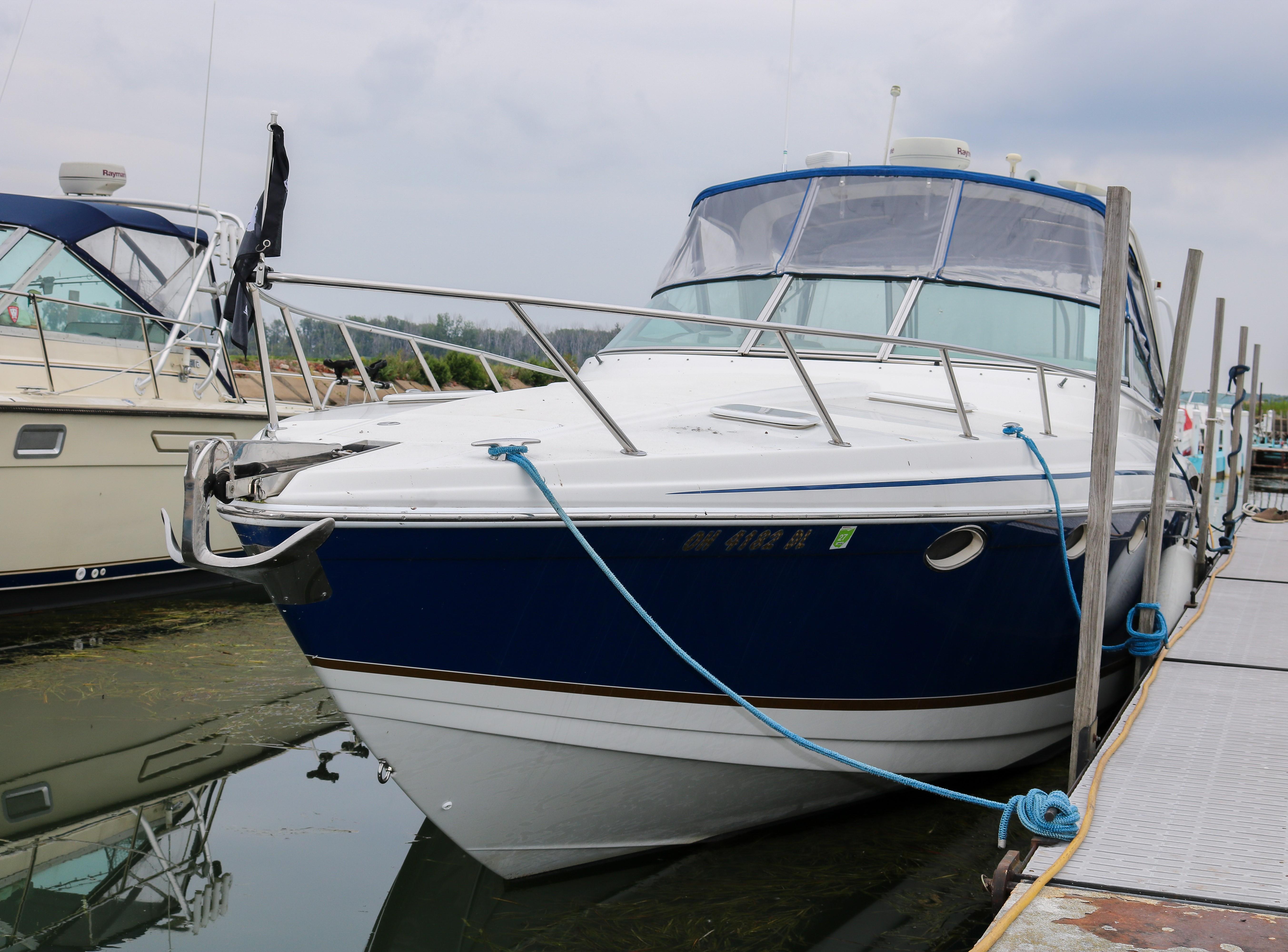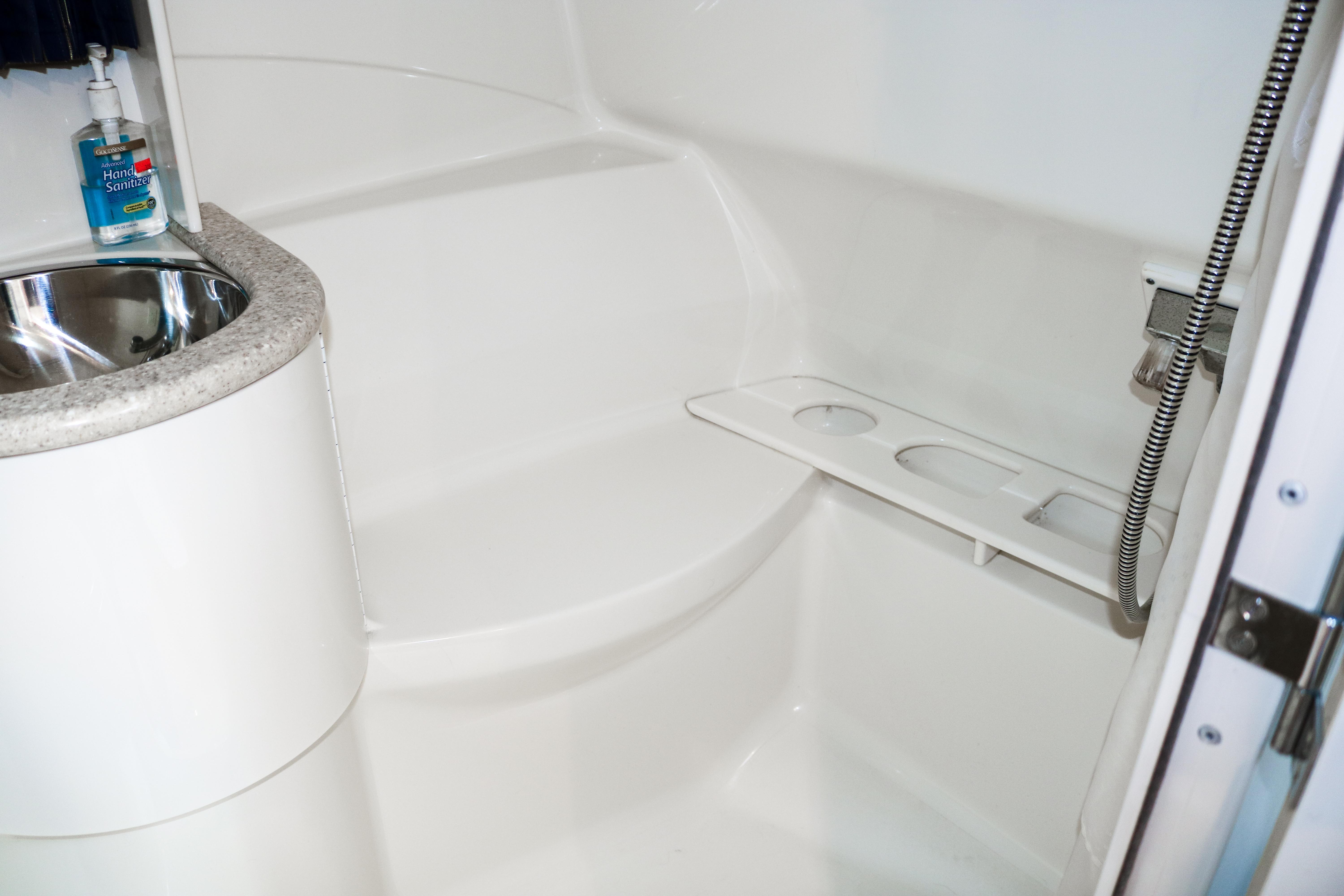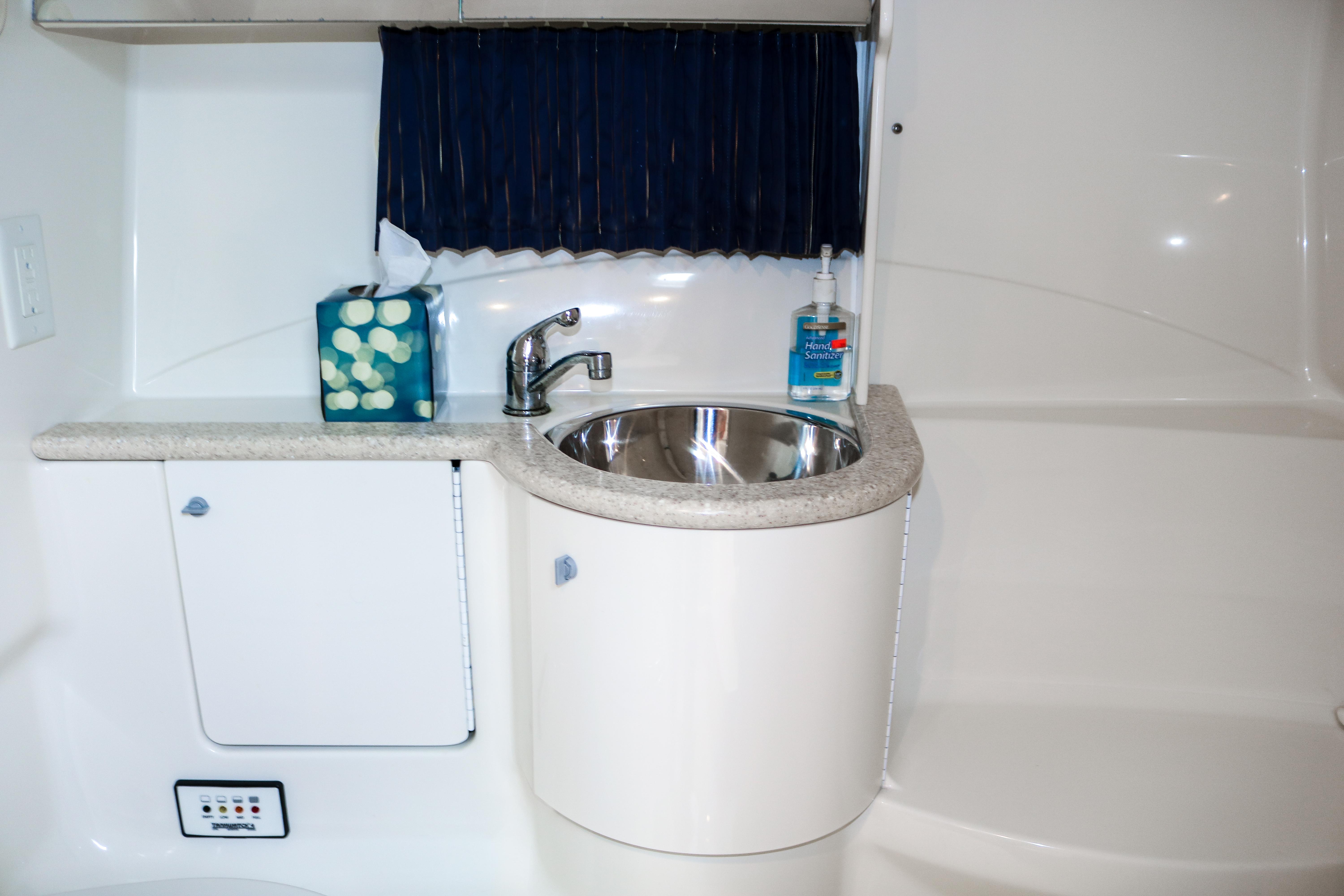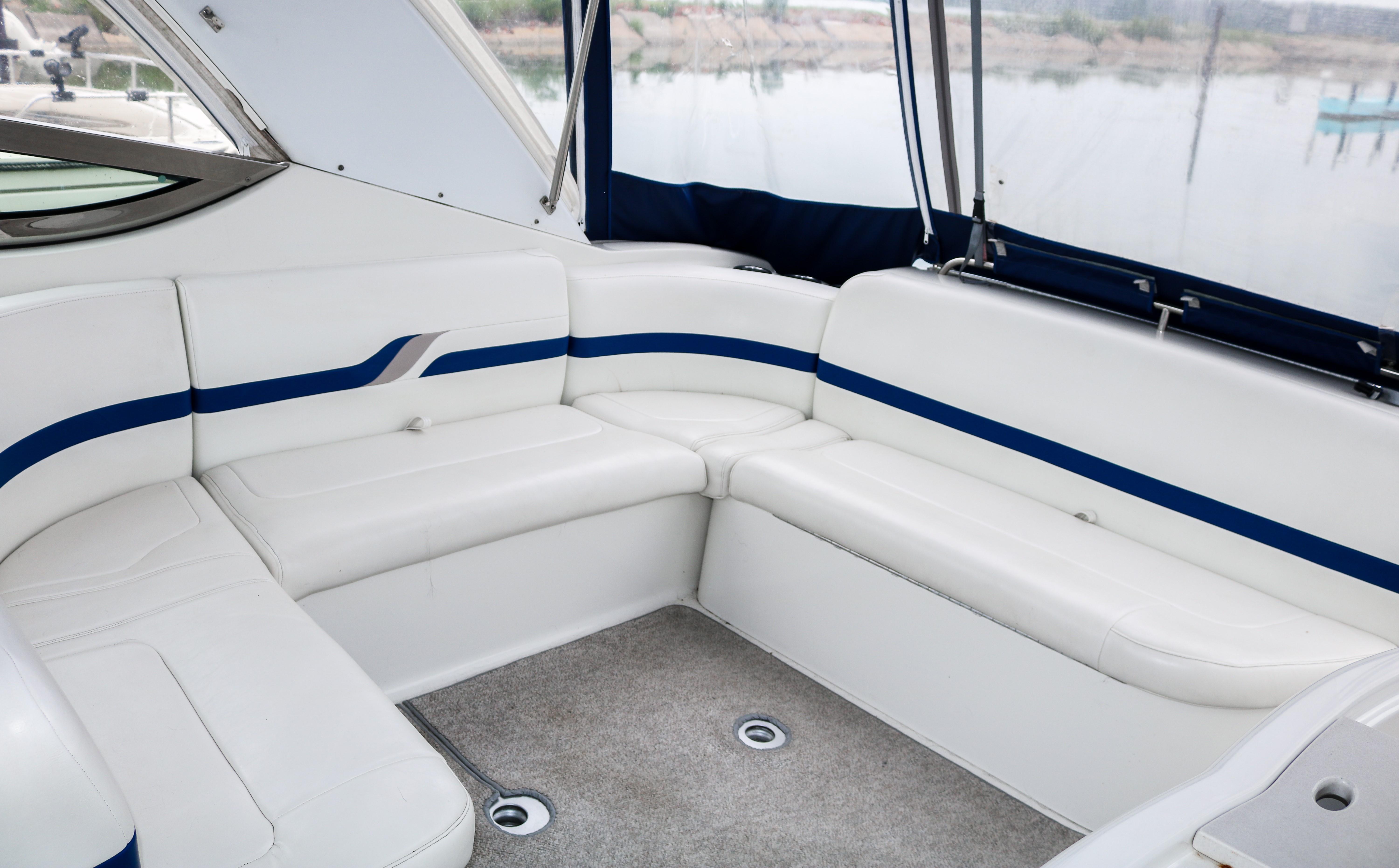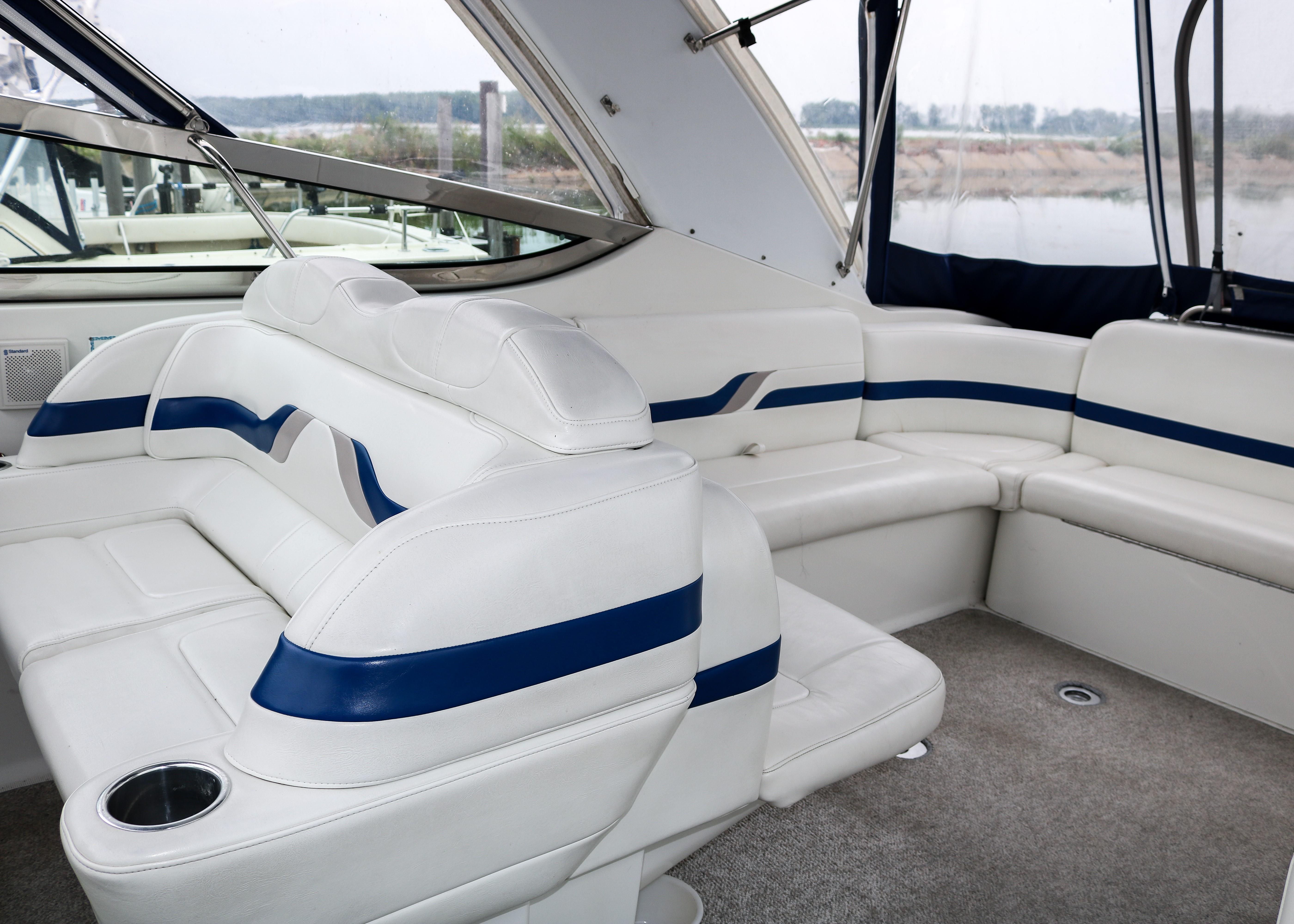 Below deck accommodations are surprisingly spacious, considering the performance-boat styling. A Corian-trimmed galley has a cooktop, microwave and sink. A dual-voltage refrigerator/freezer is several steps away. A fully enclosed head with an integral shower area has an easy-to-clean molded fiberglass finish trimmed in Corian.