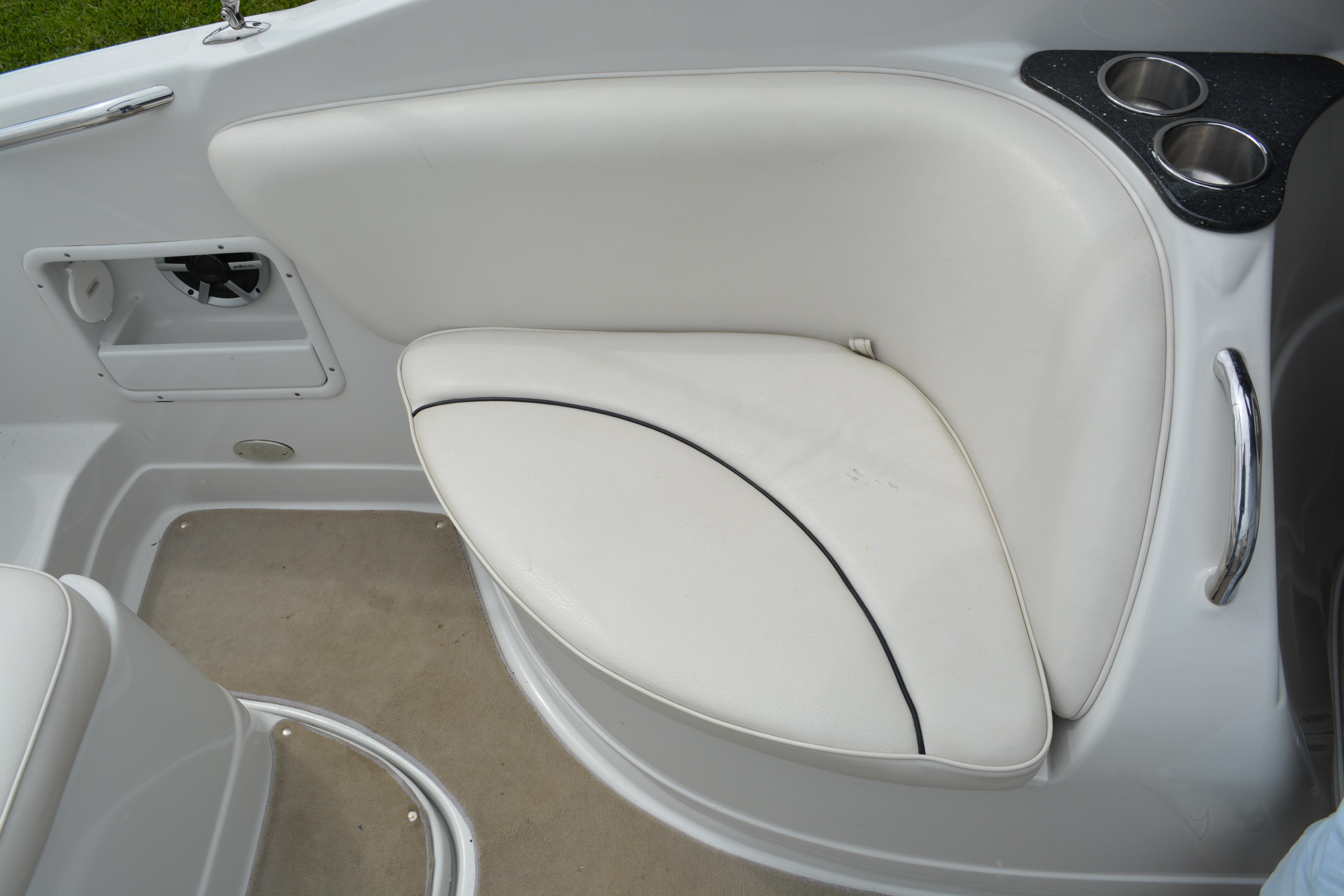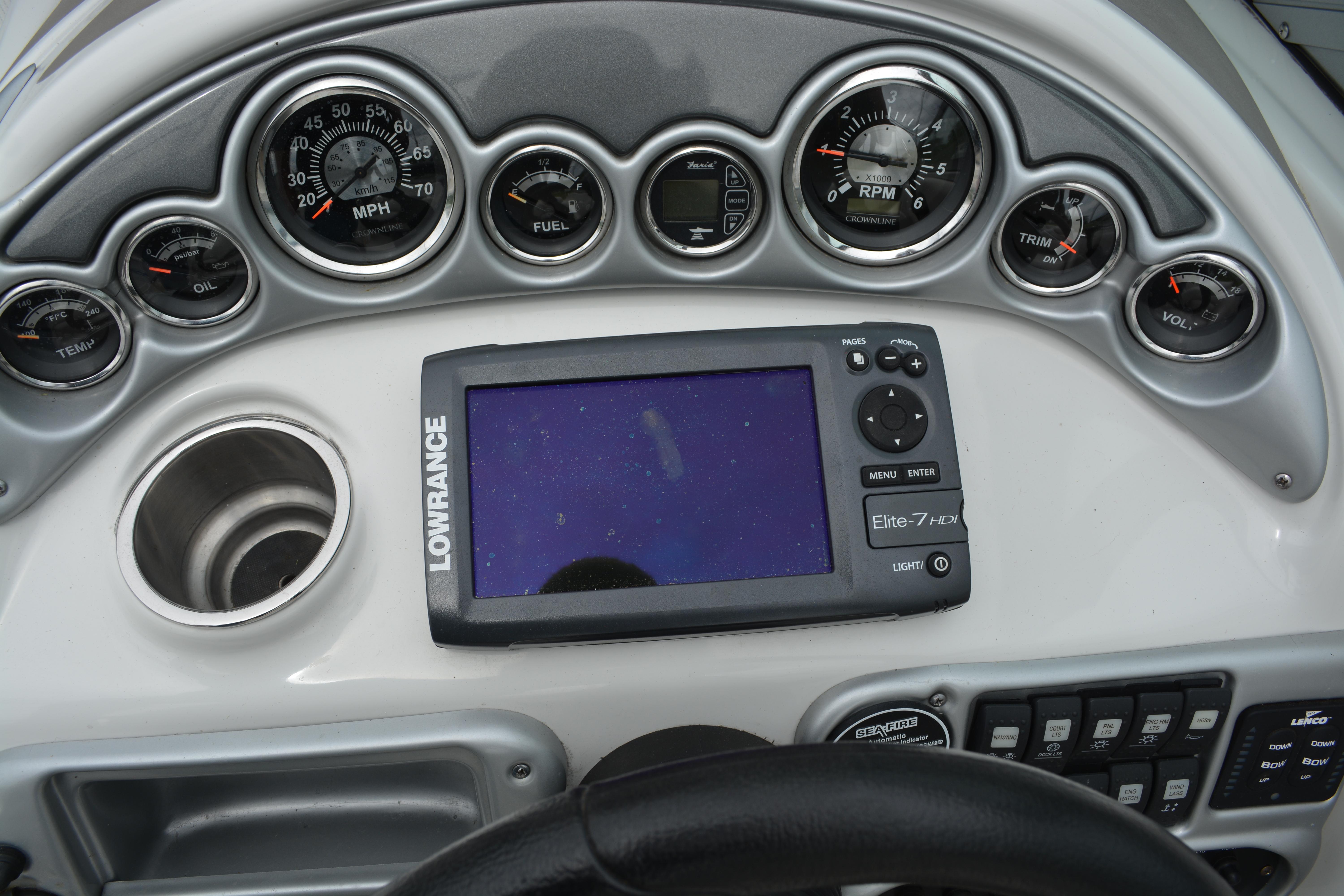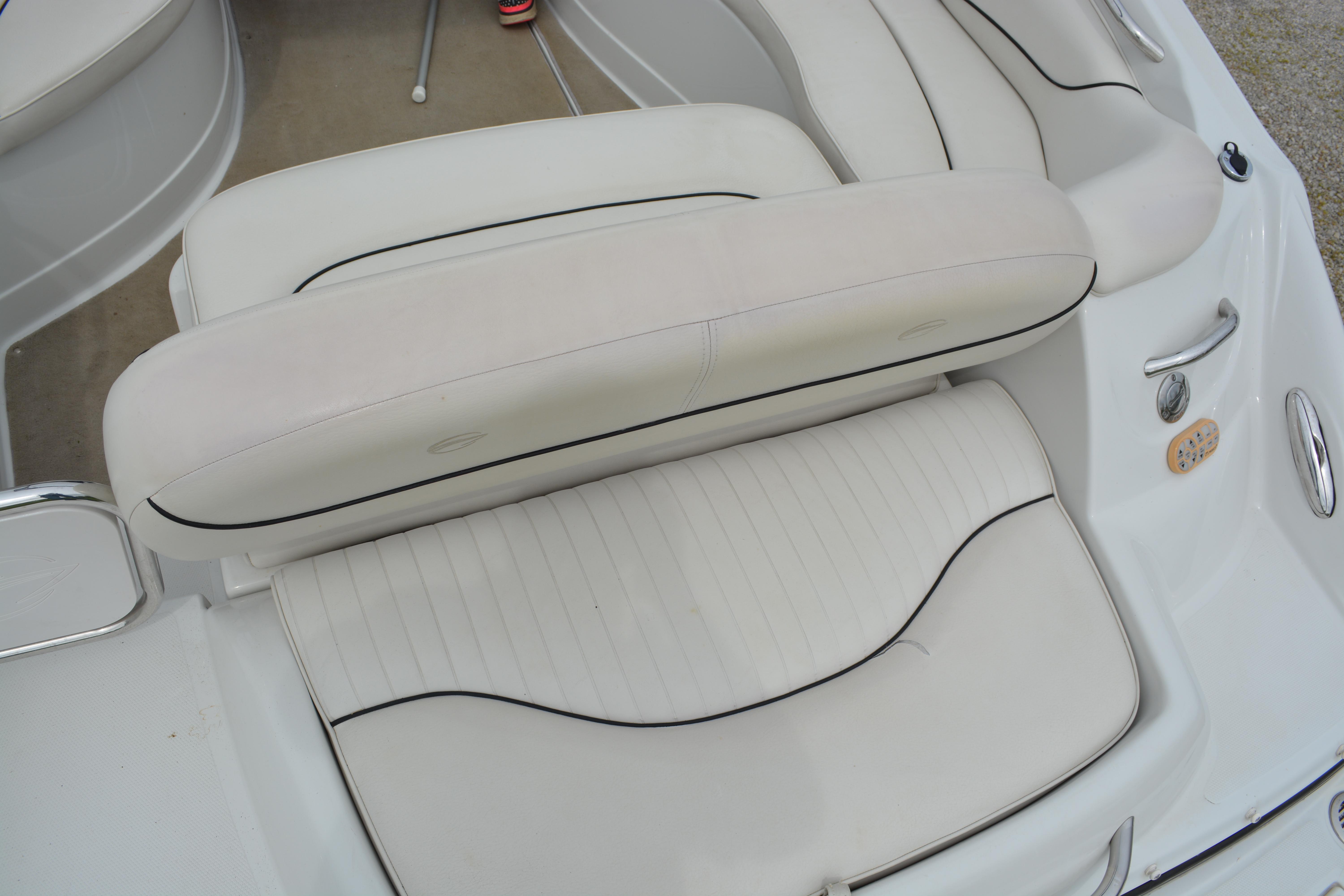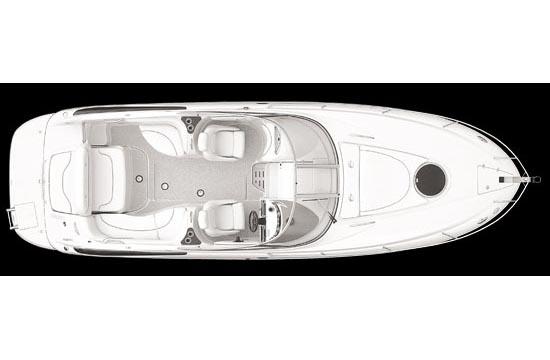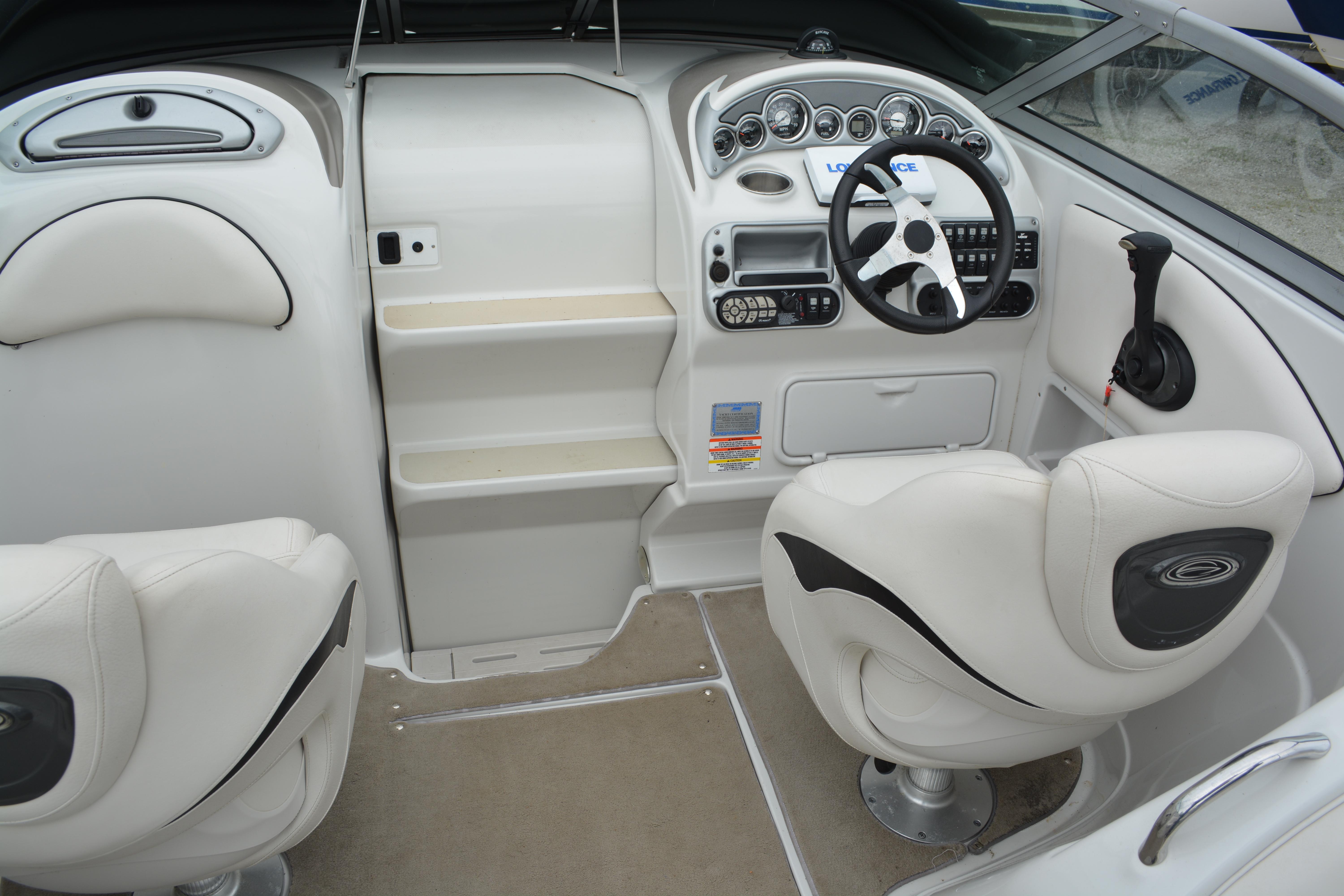 Built on Crownline's exclusive F.A.S.T. Tab hull, this beauty is not only a performer, it's a luxury vessel as well. Hull and deck standards include a classic Crownline helm with flip-up Tri-Tech bucket seats, full instrumentation, a compass, engine hour meter and tilt steering wheel. Below deck, a luxurious cabin features premium carpeting and a galley with custom cherry wood cabinets, microwave, stainless steel sink and refrigerator. An enclosed head compartment features a Vacu-Flush toilet and shower sump pump.