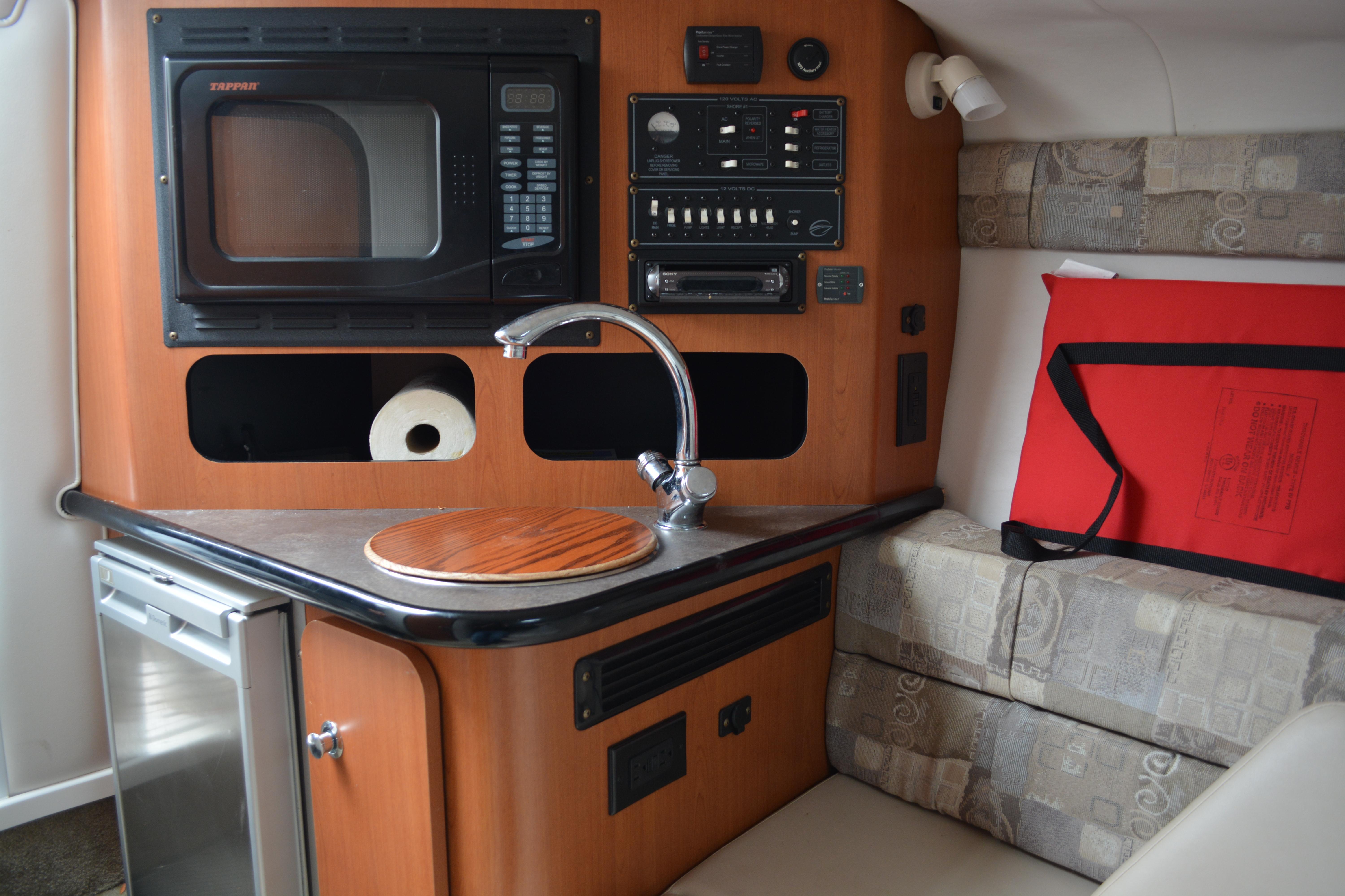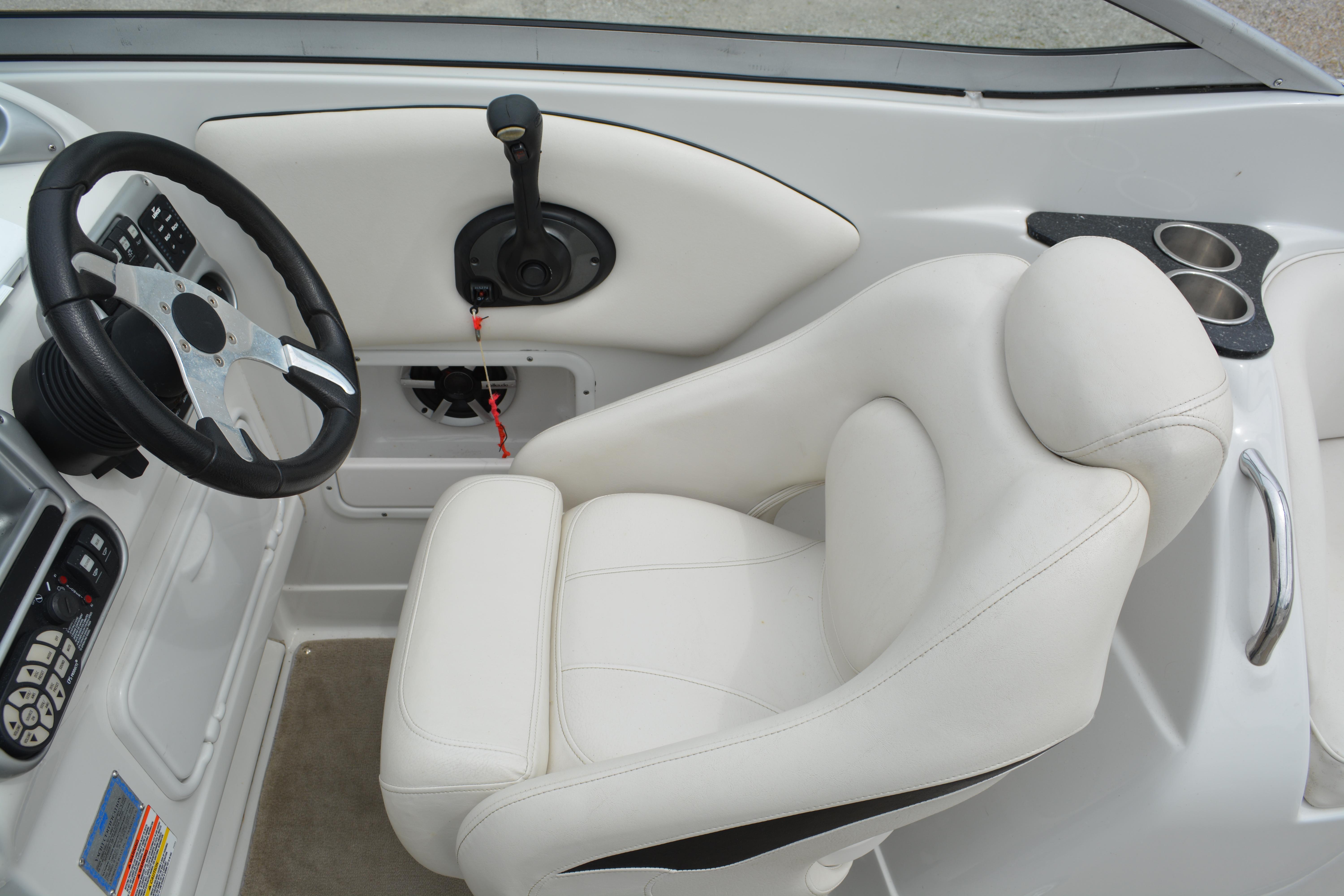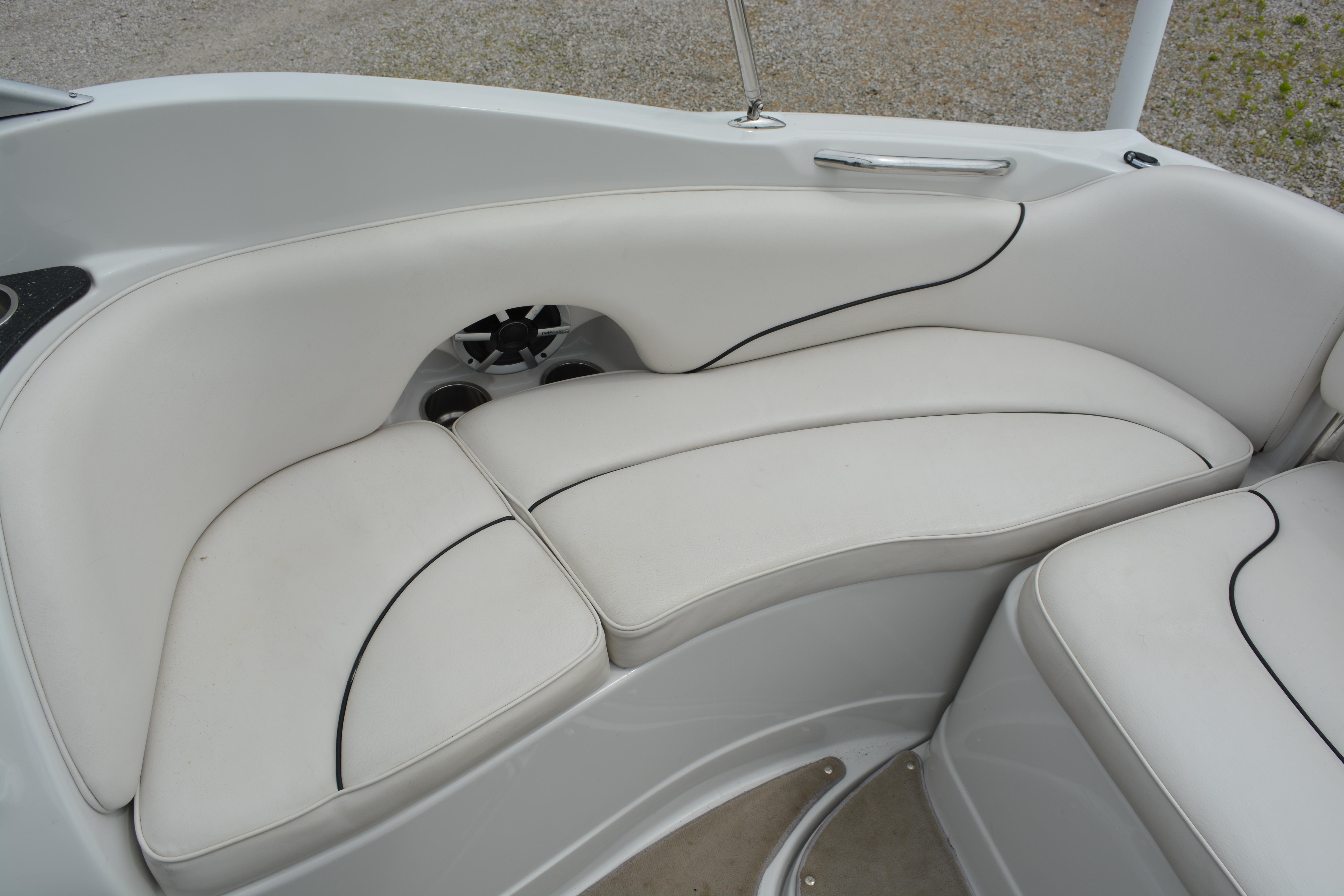 Built on Crownline's exclusive F.A.S.T. Tab hull, this beauty is not only a performer, it's a luxury vessel as well. Hull and deck standards include a classic Crownline helm with flip-up Tri-Tech bucket seats, full instrumentation, a compass, engine hour meter and tilt steering wheel. Below deck, a luxurious cabin features premium carpeting and a galley with custom cherry wood cabinets, microwave, stainless steel sink and refrigerator. An enclosed head compartment features a Vacu-Flush toilet and shower sump pump.